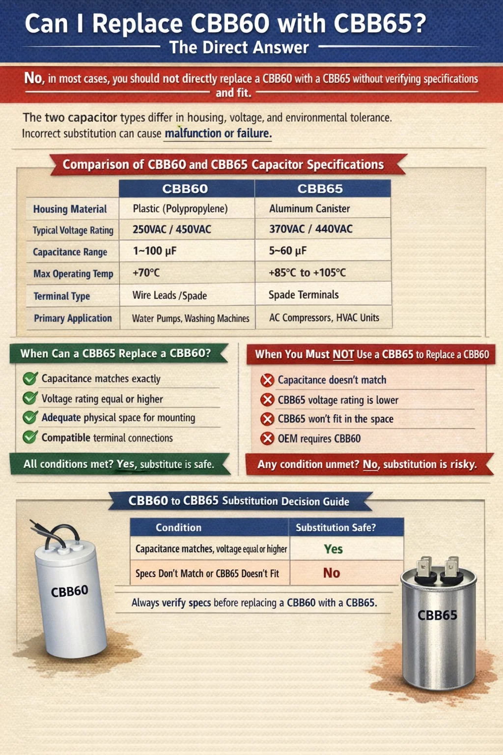 Điều đó có nghĩa là, có những trường hợp cụ thể trong đó CBB65 có thể được sử dụng làm vật thay thế chức năng cho CBB60, miễn là giá trị điện dung, định mức điện áp và cấu hình đầu cuối tương thích. Bài viết này trình bày mọi thứ bạn cần biết trước khi thực hiện việc hoán đổi đó.