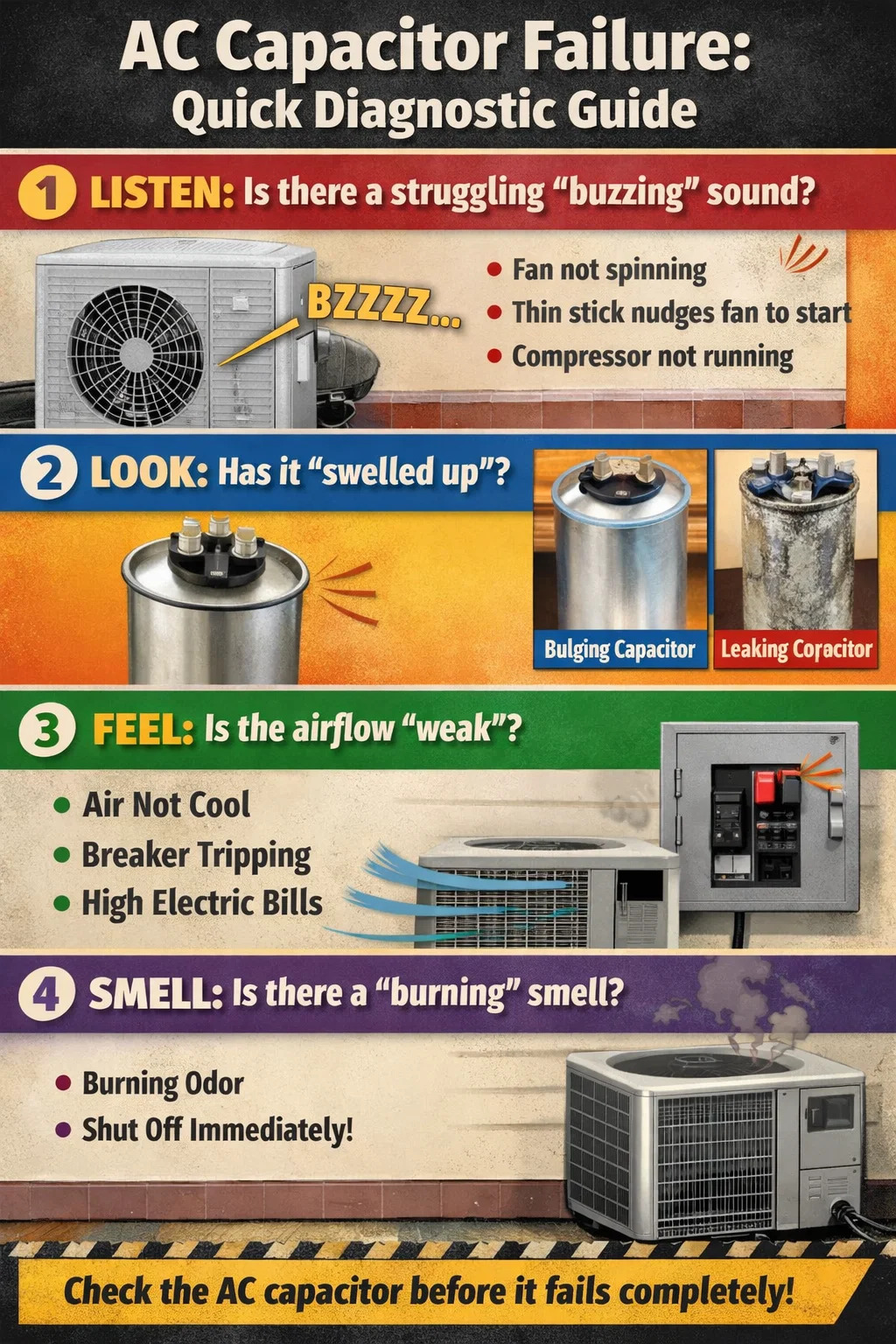 Khi máy điều hòa không khí của bạn bắt đầu hoạt động, tụ điện xoay chiều thường là phần dễ hư hỏng nhất và cũng là phần dễ chẩn đoán nhất. Bạn không cần phải tháo rời mạch điện phức tạp; bạn có thể xác định đại khái xem nó có cần thay thế hay không bằng các phương pháp đơn giản sau: