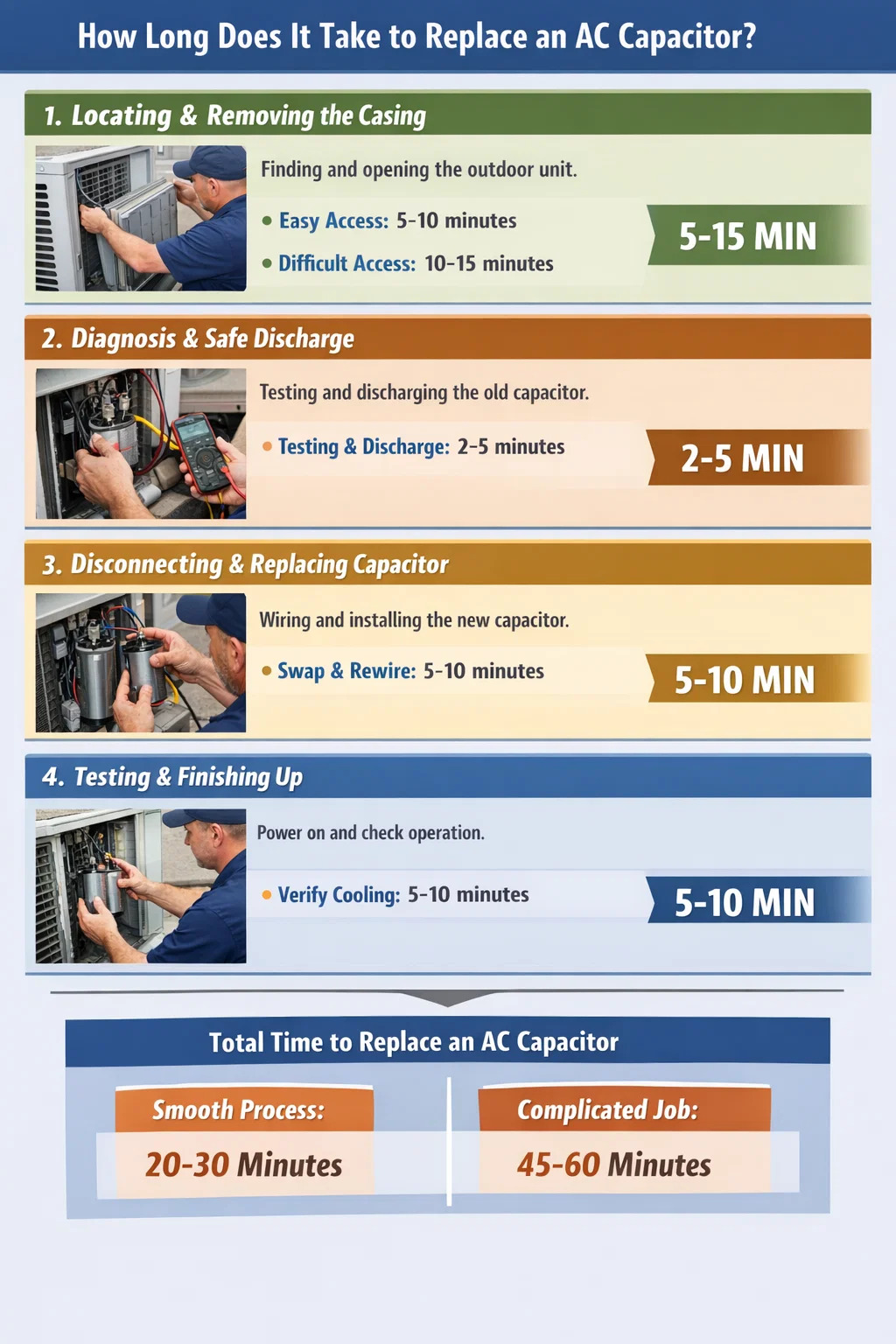 Thực sự mất bao lâu để thay thế một tụ điện xoay chiều ? Nếu chỉ xem vài phút kỹ thuật viên đang làm việc, có thể bạn sẽ nghĩ công việc nhanh đến mức đáng ngạc nhiên. Nhưng từ lúc kỹ thuật viên đến cho đến khi máy điều hòa thổi khí lạnh trở lại, sẽ có một quy trình hoàn chỉnh.