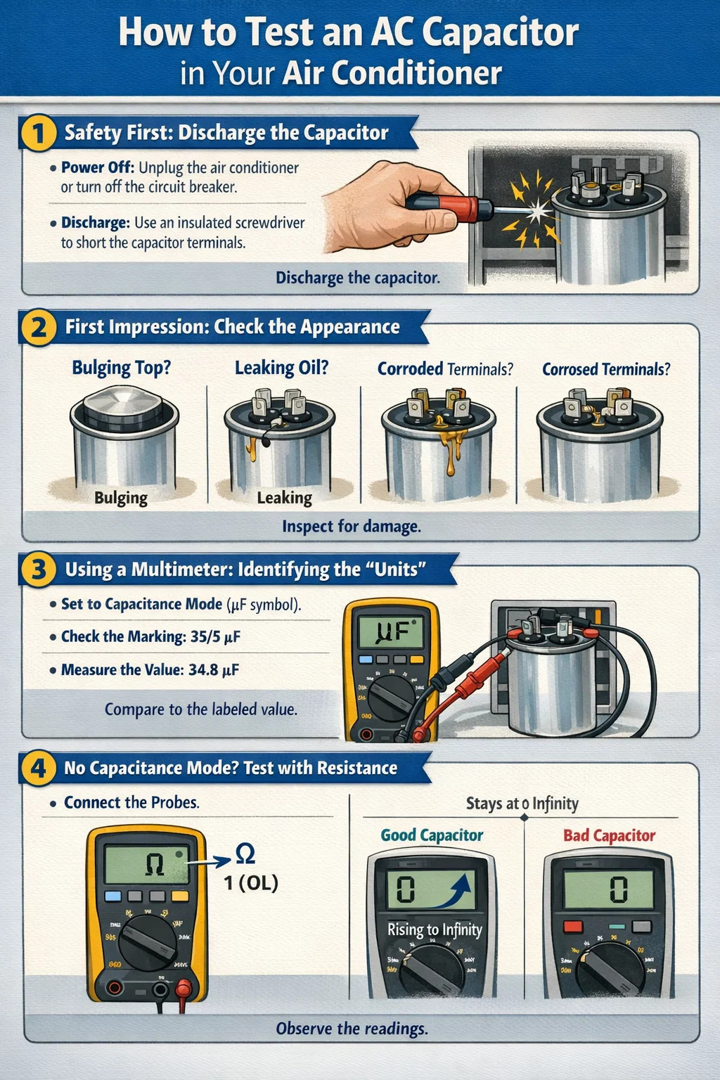Việc xác định tụ điện xoay chiều trong điều hòa tốt hay xấu không cần đến kiến thức kỹ thuật điện tử chuyên nghiệp. Chỉ cần bạn có đồng hồ vạn năng có chức năng "kiểm tra điện dung", bạn có thể làm theo các bước sau và tự mình trở thành bán chuyên gia.