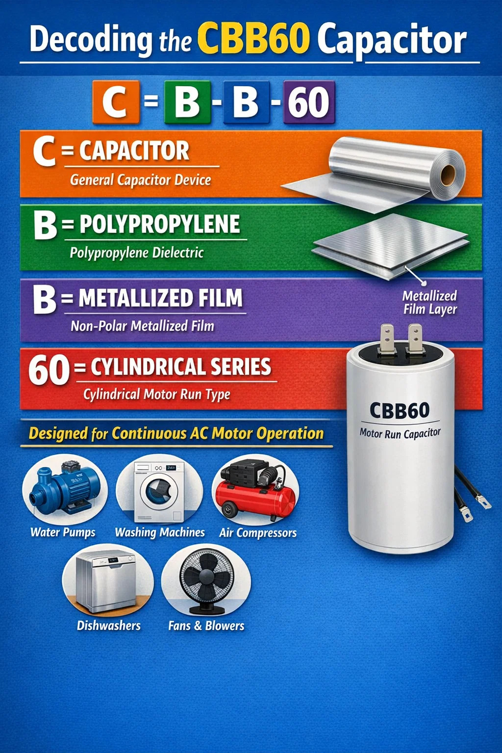 Bản thân mã này là chữ viết tắt gồm chữ và số, trong đó mỗi chữ cái mang một ý nghĩa kỹ thuật cụ thể liên quan đến cấu trúc bên trong và ứng dụng của thiết bị. Không giống như các tụ điện khởi động sẽ ngắt mạch khi động cơ đạt tốc độ, tụ điện CBB60 được thiết kế để đảm bảo độ bền và khả năng chịu tải điện liên tục.