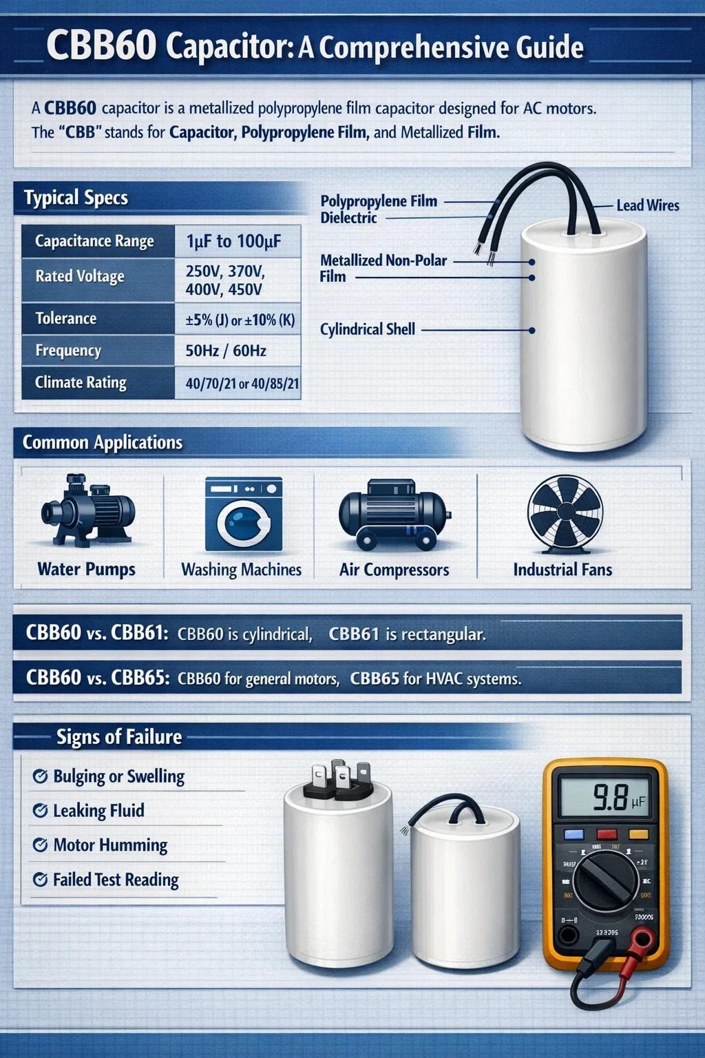 A tụ điện CBB60 là một loại tụ điện màng polypropylen kim loại chuyên dụng được thiết kế chủ yếu cho các ứng dụng động cơ AC. Ký hiệu "CBB" là viết tắt của thành phần vật liệu của nó: "C" cho tụ điện, "B" cho chất điện môi màng polypropylen và "B" thứ hai cho màng kim loại không phân cực. Những tụ điện này được phân loại chính thức là tụ điện chạy, nghĩa là chúng ở trong mạch điện trong khi động cơ đang hoạt động để duy trì mô-men xoắn và nâng cao hiệu suất.
